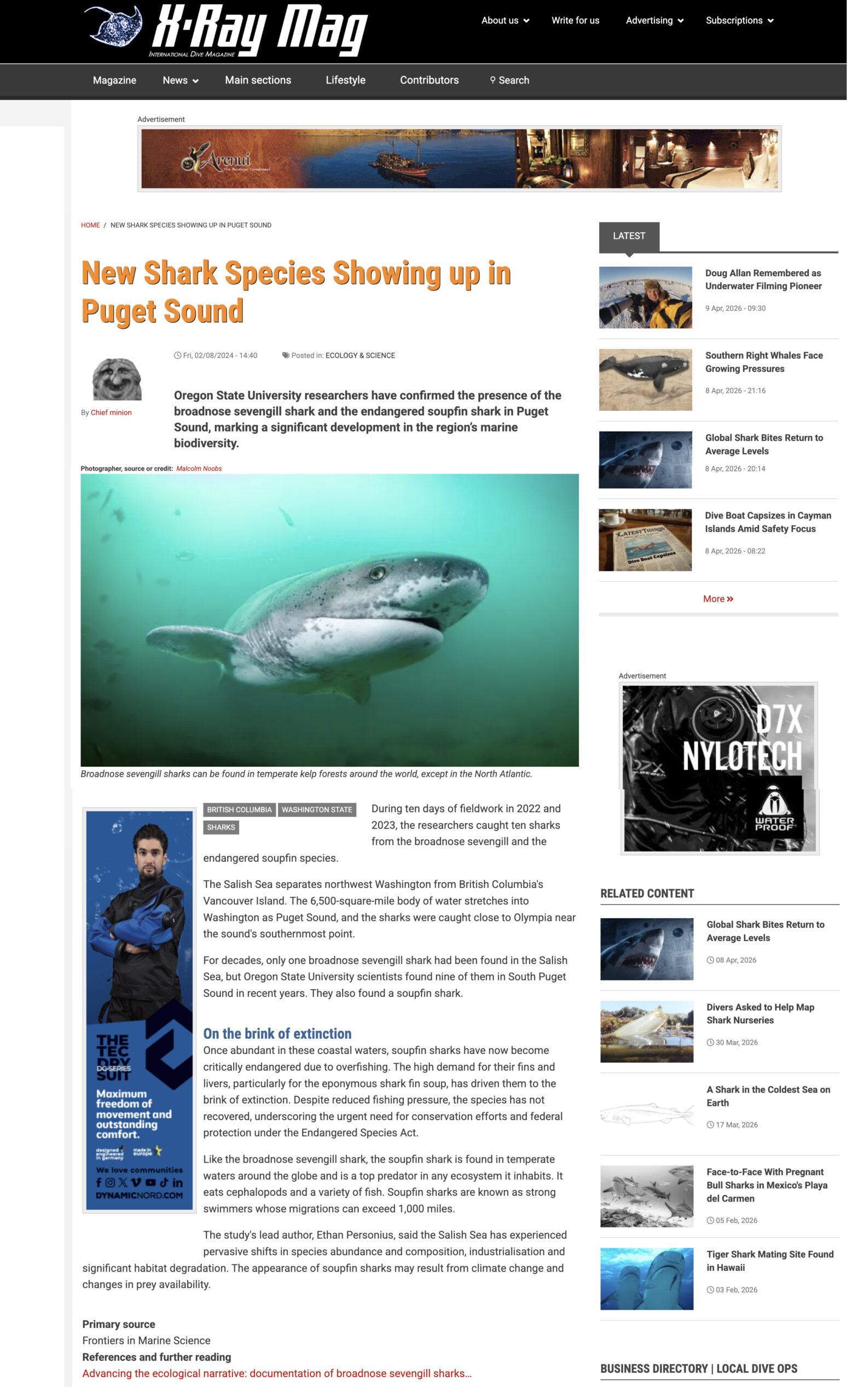 Malcolm 2 August 2024 Conservation, News, Publications X-Ray Mag: Broadnose Sevengill shark X-Ray Magazine used one of my Broadnose Sevengill shots for an article on the sharks having been seen in Puget Sound Screenshot
